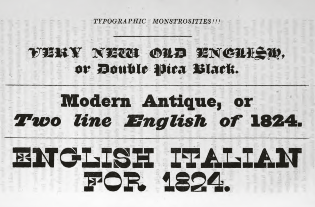 “Oh ! sombras sagradas de Moxon e Van Dijke, de Baskerville e Bodoni”, clamou Thomas C. Hansard, continuando ”o que dirias das monstruosidades tipográficas aqui expostas, que a moda da nossa época produziu?”, (Hansard, 1825, p. 618).
